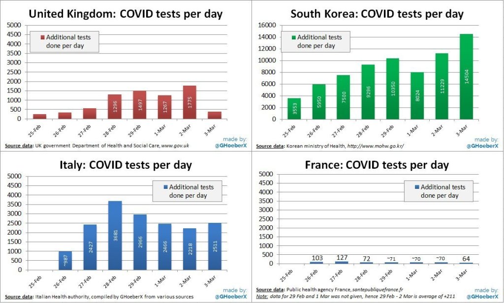 Aggiungiamo a quanto sopra il fatto che gli screening di massa sono stati fatti in Lombardia e Veneto all’inizio della crisi del coronavirus, sebbene questo NON accada ad esempio nè in Svizzera nè in Francia, come indicato di seguito qui (LINK CH, LINK FR). Anche la circolare del ministero della Sanità del 22.03.2020 (0005443-22/02/2020-DGPRE-DGPRE-P) è molto specifica sull’argomento: i tamponi si fanno SOLO su persone sintomatiche E dietro a specifiche ben precise [ossia nessuno screening di massa!]: