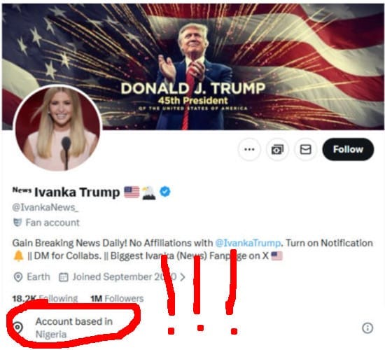 Sembra che quel particolare fan di Trump e Ivanka sia basato nella roccaforte MAGA del… Nigeria? E non sono solo quegli account. L’account fan di Barron Trump @BarronTNews_(che postava messaggi di compleanno commoventi a “papà” Donald prima di essere smascherato come account fan)? L’account “UltraMAGA Trump 2028”? Quegli account e numerosi altri sono stati scoperti provenire da angoli altrettanto remoti del globo.Puoi immaginare il campo giorno che i titolisti dei media legacy dinosauri si sono divertiti con queste rivelazioni: