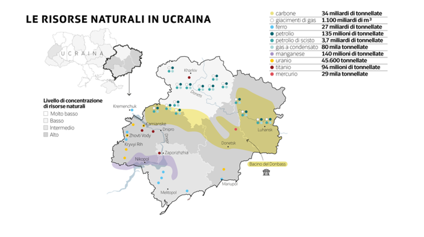 Il Donbass possiede infatti una varietà di risorse naturali (carbone, gas, litio, petrolio, acciaio, ferro, uranio, ma anche terre rare, manganese), sono stati individuati 97 tipi di minerali distribuiti in 20 mila depositi e siti minerari, il tutto per un valore complessivo stimato circa 7.5 trilioni di dollari.