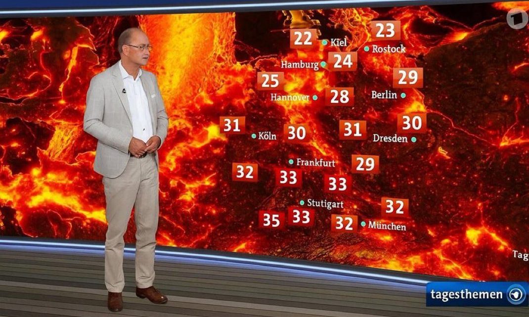 Un bollettino meteorologico rosso incandescente. Temperature come fiamme infernali. Un conduttore di telegiornale davanti a una mappa infuocata. Ciò che fino a pochi anni fa sarebbe passato per un meme di internet, oggi va in onda in prima serata nei notiziari principali dei media pubblici. E la cosa più spaventosa: i faktenchecker devono ormai chiedere seriamente se tali immagini siano autentiche o generate dall’IA.