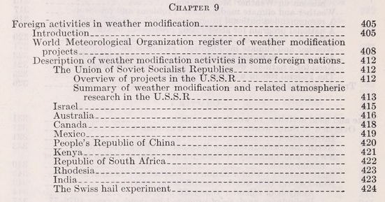 Come del resto sarebbe interessante approfondire e commentare un documento del Congresso americano di Maggio del 1978 e reso pubblico on-line nel 2013 (11) di oltre 746 pagine nel sito dell’Università della Florida dal titolo “Weather Modification: Programs, Problems, Policy and Potential“. Un documento forse più esplosivo delle recenti dichiarazioni del Direttore della CIA, (ndr vedi qui) che a questo punto di questa brevissima analisi fin qui riportata, sono semplicemente una ulteriore conferma di quanto oggi è stato fatto con la geoingegneria, non solo a livello teorico. Infatti nel documento in questione sono riportati i dati di esperimenti militari e non solo condotti in moltissimi stati americani fin da i primi anni del 1940, con una comparazione di costi e benefici con altri stati nei quali sono state condotte sperimentazioni simili su larga scala, in prima linea l’ex URSS, ma anche Israele, Cina e molti altri stati.