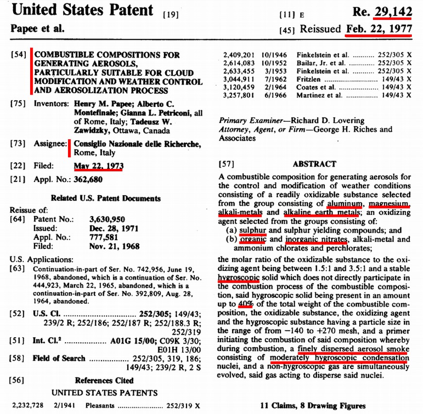 E’ possibile modificare le condizioni meteorologiche e manipolare i cicli pluviometrici,intervenendo sulle nubi tramite l’impiego di carburanti idonei? La risposta è affermativa. A titolo di esempio, vi proponiamo un brevetto risalente al lontano 1973 e nel 1977 assegnato al Consiglio Nazionale per le ricerche (C.N.R.). Nel testo è spiegato in modo approfondito com’è possibile alterare la composizione del combustibile al fine di abbattere l’umidità atmosferica e dissolvere le formazioni nuvolose che potrebbero causare precipitazioni piovose. Ciò è possibile additivando alluminio, magnesio ed altri elementi alcalini che, reagendo con i solfuri di scarto, derivanti dalla combustione, determinano una fine miscela di nanopolveri igroscopiche. E’ quindi evidente com’è vantaggiosa ed economica la collaborazione delle compagnie civili, giacché la capillarità delle rotte commerciali permette di intervenire ovunque si intenda distruggere o deviare intere perturbazioni. …