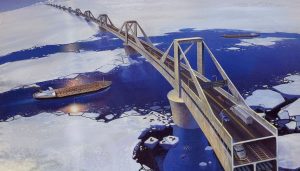 Guerra Fredda: L’ingegnere Tung-Yen Lin avanzò negli anni ’50 e ’60 la proposta di un “Intercontinental Peace Bridge” per favorire la pace USA-URSS, stimando costi di 4 miliardi di dollari nel 1994.